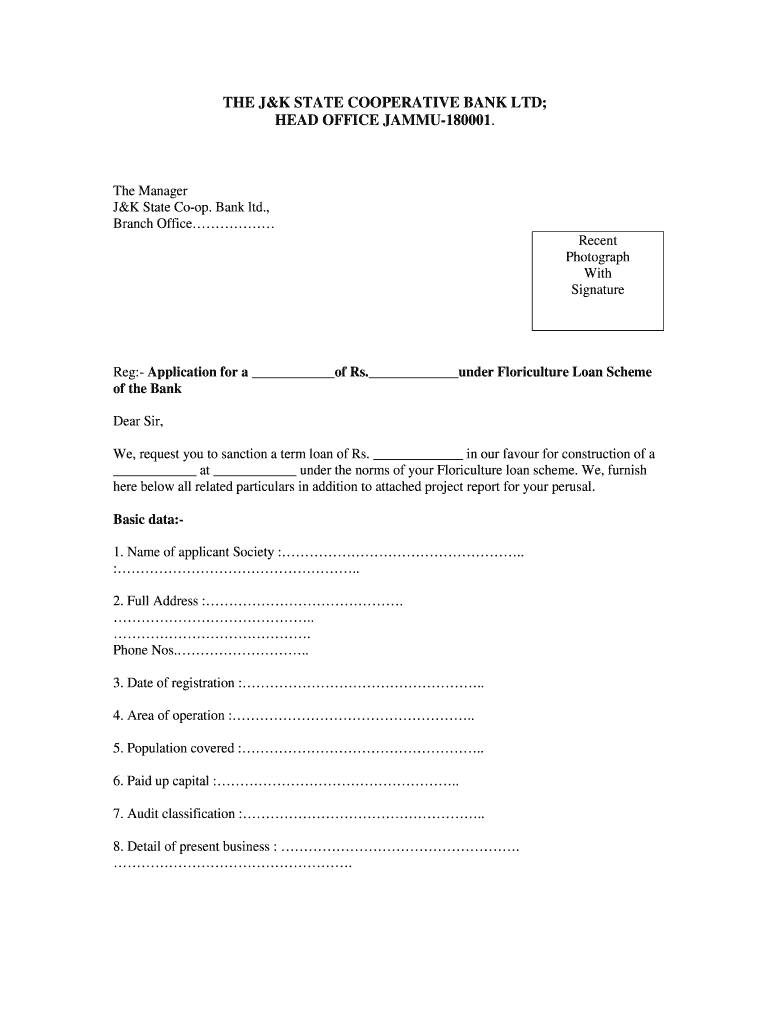THE J&K STATE COOPERATIVE BANK LTD; HEAD OFFICE JAMMU180001. The Manager J&K State Coop. Bank ltd., Branch Office Recent Photograph With Signature: Application for an of Rs. under Agriculture Loan