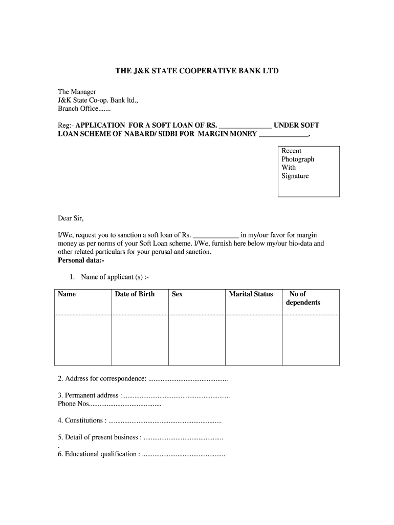 THE J&K STATE COOPERATIVE BANK LTD The Manager J&K State Coop. Bank ltd., Branch Office....... Reg: APPLICATION FOR A SOFT LOAN OF RS. UNDER SOFT LOAN SCHEME OF NAB ARD/ SIDE FOR MARGIN MONEY. Recent