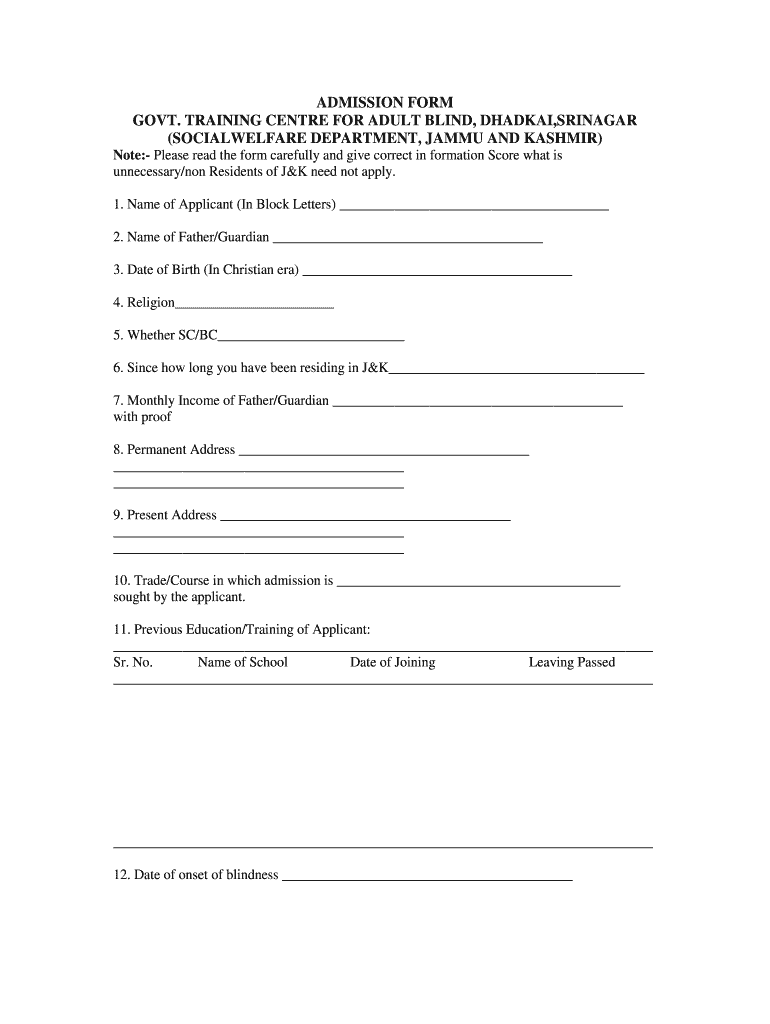 ADMISSION FORM GOVT. TRAINING Center FOR ADULT BLIND, DHAKA, SRINAGAR (SOCIALWELFARE DEPARTMENT, JAMMY AND KASHMIR) Note: Please read the form carefully and give correct in formation Score what is