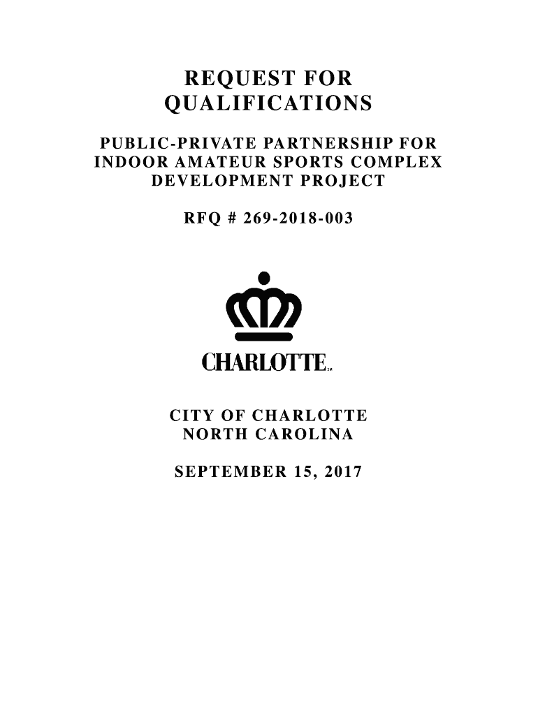REQUEST FOR QUALIFICATIONS P U B L I C P R I VAT E PA RT N E R S H I P F O R I N D O O R A M AT E U R S P O RT S C O M P L E X DEVELOPMENT PROJECT RFQ # 2692018003CITY OF CHARLOTTE N O RT H C A R