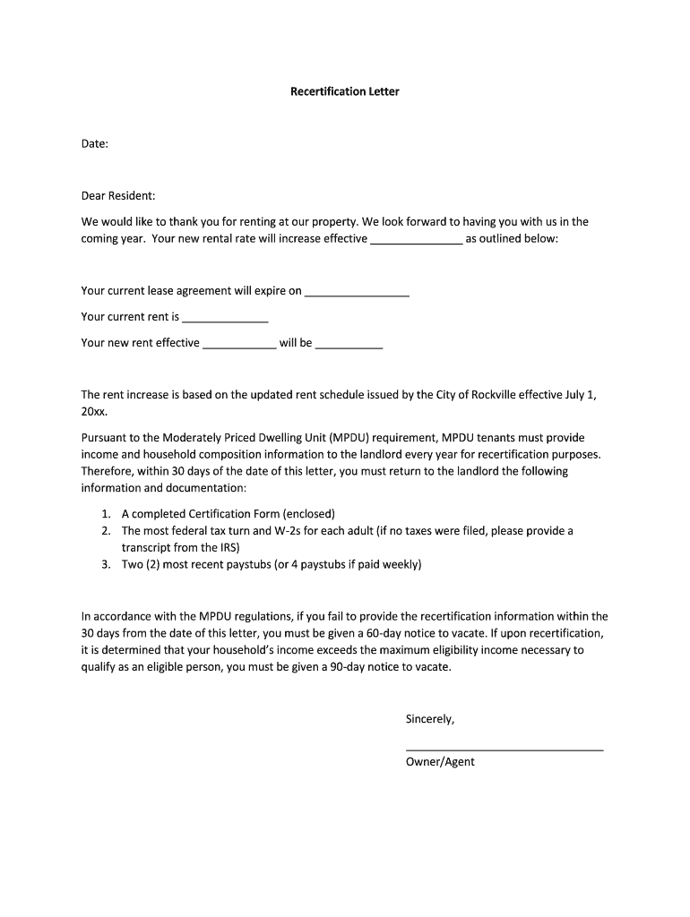 Get the free Recertification Letter Date: Dear Resident: We would like to thank ...