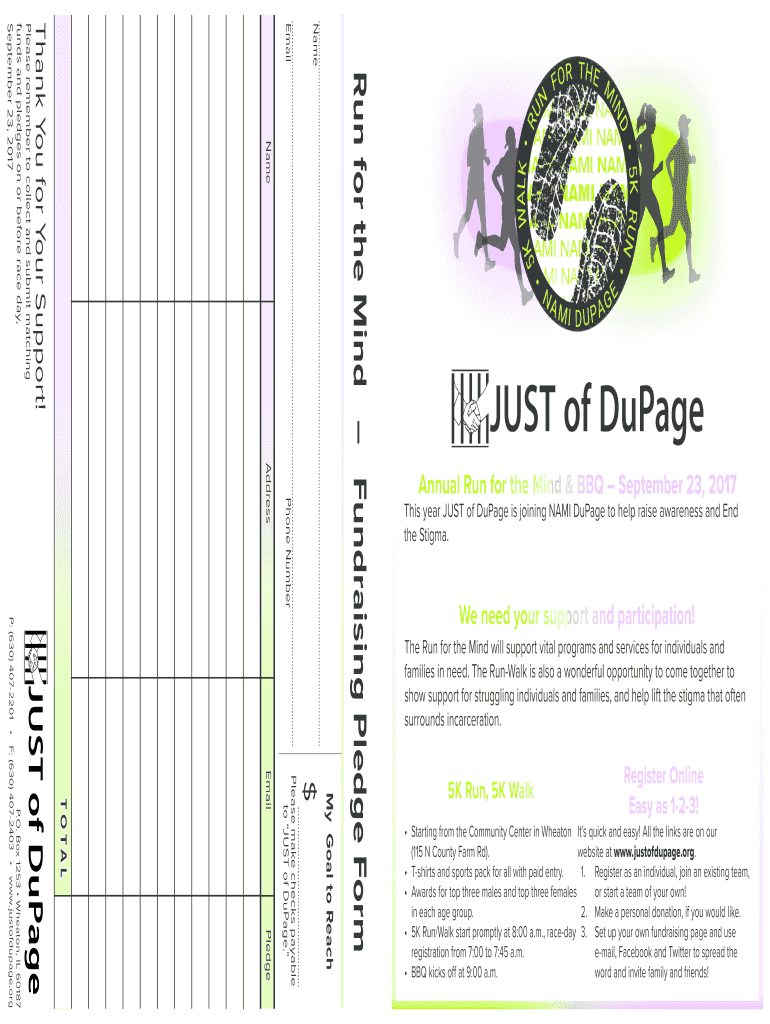 NameAddressMy Goal to Reach×PledgePlease make checks payable to JUST of Dupage. Maillot LP. O. Box 1253 Wheaton, IL 60187 P: (630) 4072201 F: (630) 4072403 www.justofdupage.orgRun for the Mind Fundraising