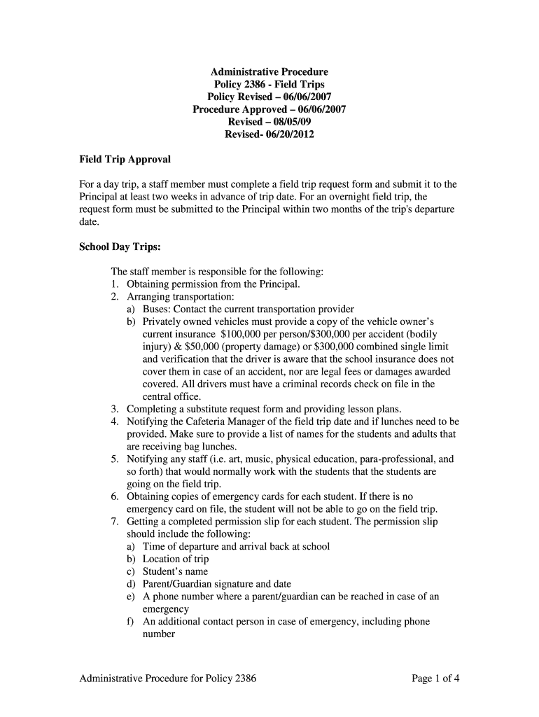 Administrative Procedure Policy 2386 Field Trips Policy Revised 06/06/2007 Procedure Approved 06/06/2007 Revised 08/05/09 Revised 06/20/2012 Field Trip Approval For a day trip, a staff member must