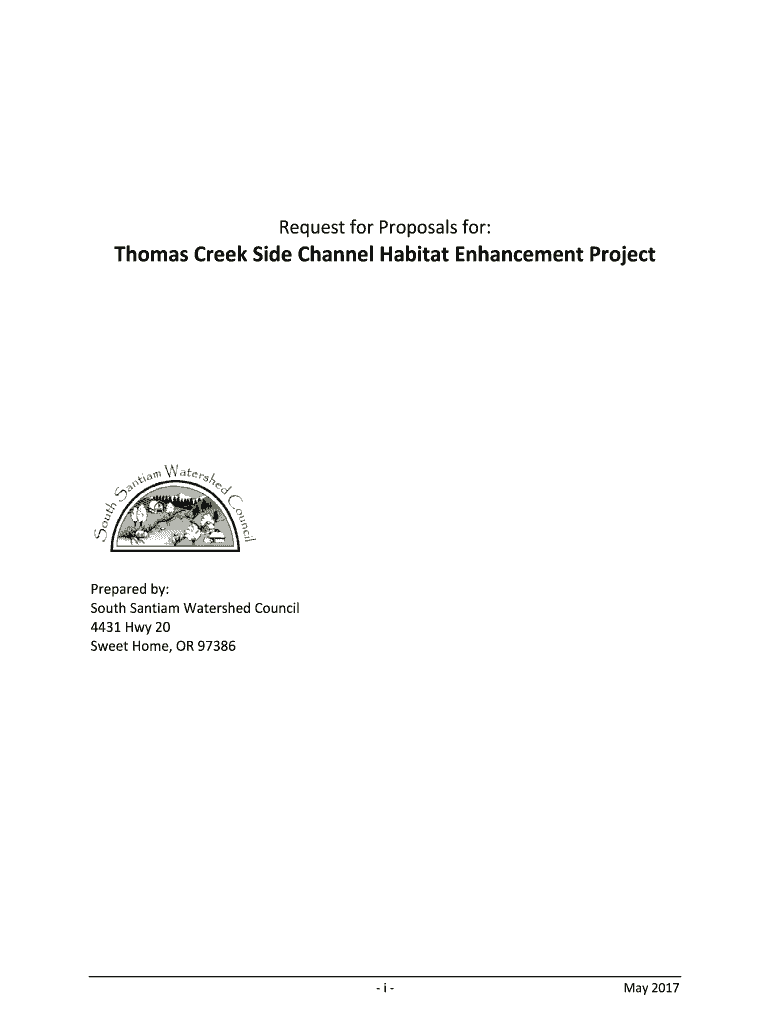 Request for Proposals for:Thomas Creek Side Channel Habitat Enhancement ProjectPrepared by: South Santa Watershed Council 4431 Hwy 20 Sweet Home, OR 97386iMay 2017Thomas Creek Side Channel Habitat