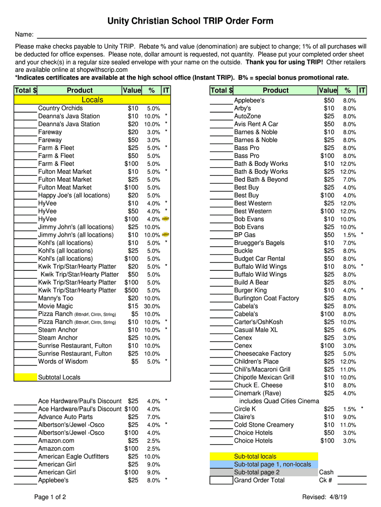 Get the free Unity Christian School TRIP Order Form