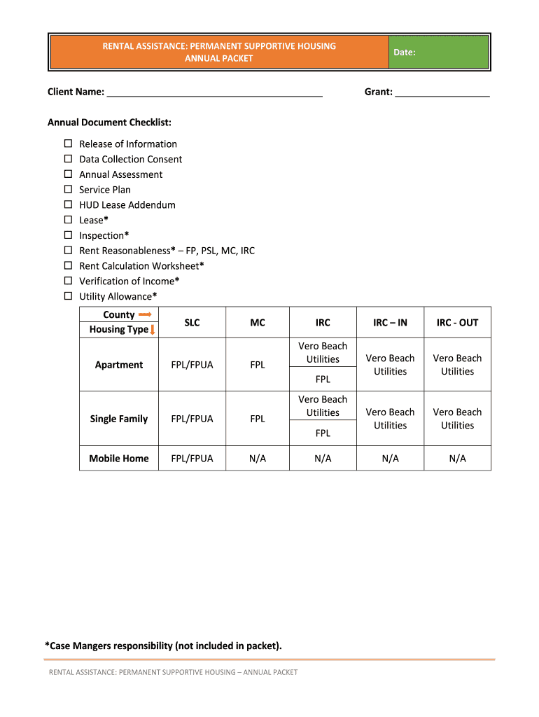 RENTAL ASSISTANCE: PERMANENT SUPPORTIVE HOUSING ANNUAL PACKETClient Name: Date:Grant: Annual Document Checklist: Release of Information Data Collection Consent Annual Assessment Service Plan HUD Lease