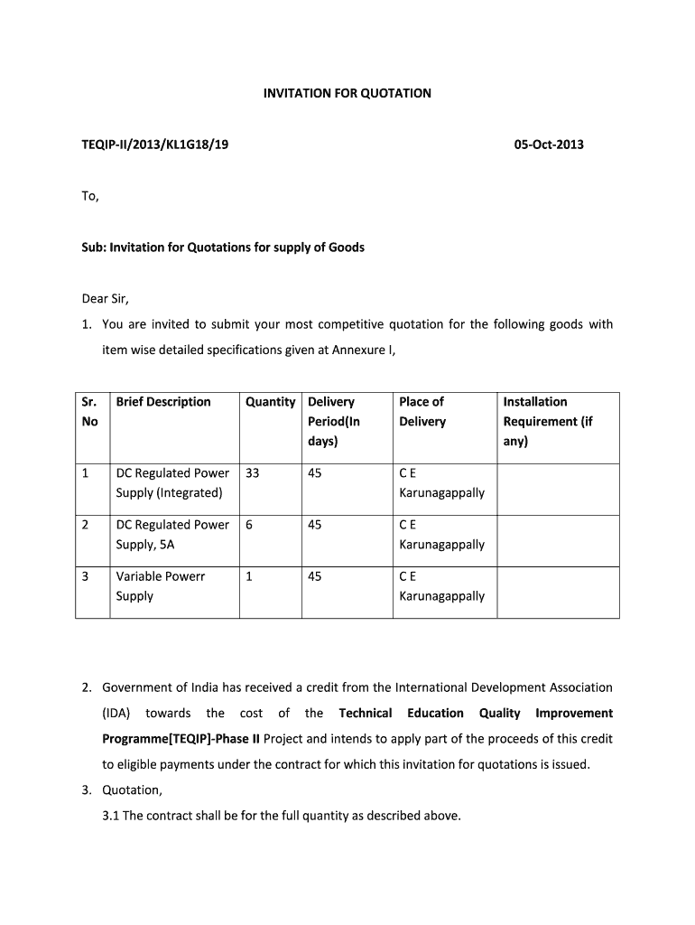 INVITATION FOR QUOTATIONTEQIPII/2013/KL1G18/1905Oct2013To,Sub: Invitation for Quotations for supply of Goodyear Sir,