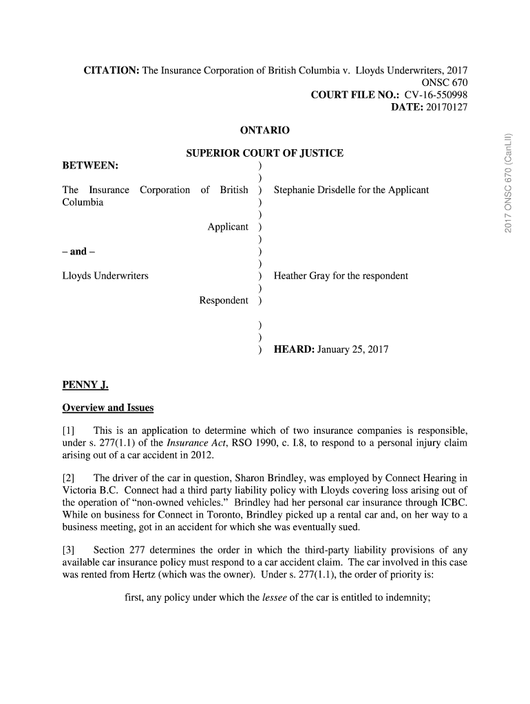 ONTARIO SUPERIOR COURT OF JUSTICE)) The Insurance Corporation of British) Stephanie Dispelled for the Applicant Columbia)) Applicant))) and) Lloyd's Underwriters) Heather Gray for the respondent)