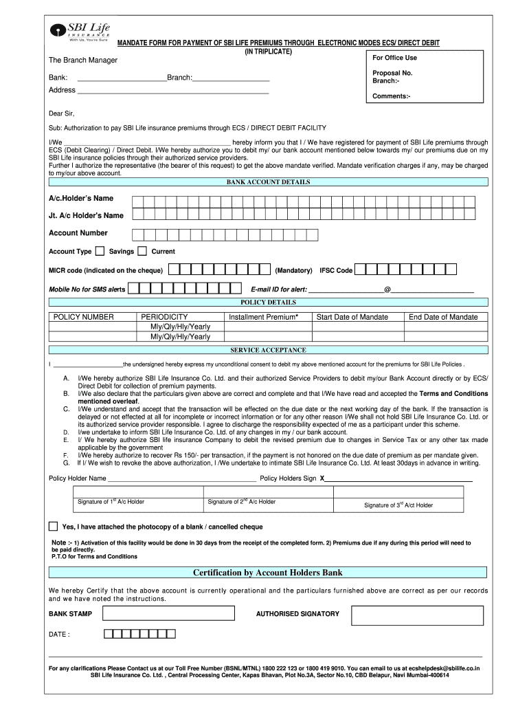 The form can be used by existing SBI Life Insurance policyholders and bank account holders who wish to authorize direct debits for premium payments.
