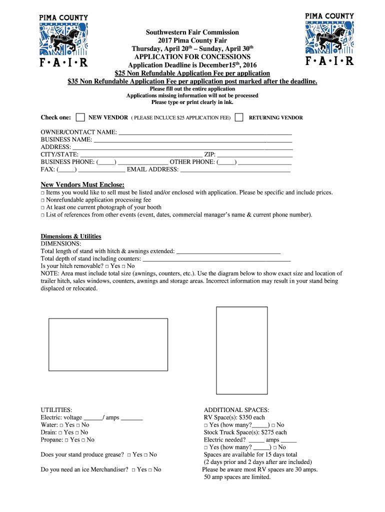 Southwestern Fair Commission 2017 Pima County Fair Thursday, April 20th Sunday, April 30th APPLICATION FOR CONCESSIONS Application Deadline is December15th, 2016 ×25 Non-Refundable Application Fee
