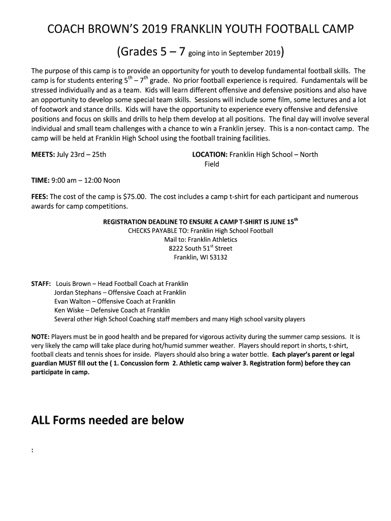 COACH BROWNS 2019 FRANKLIN YOUTH FOOTBALL CAMP (Grades 5 7 going into in September 2019) The purpose of this camp is to provide an opportunity for youth to develop fundamental football skills. The