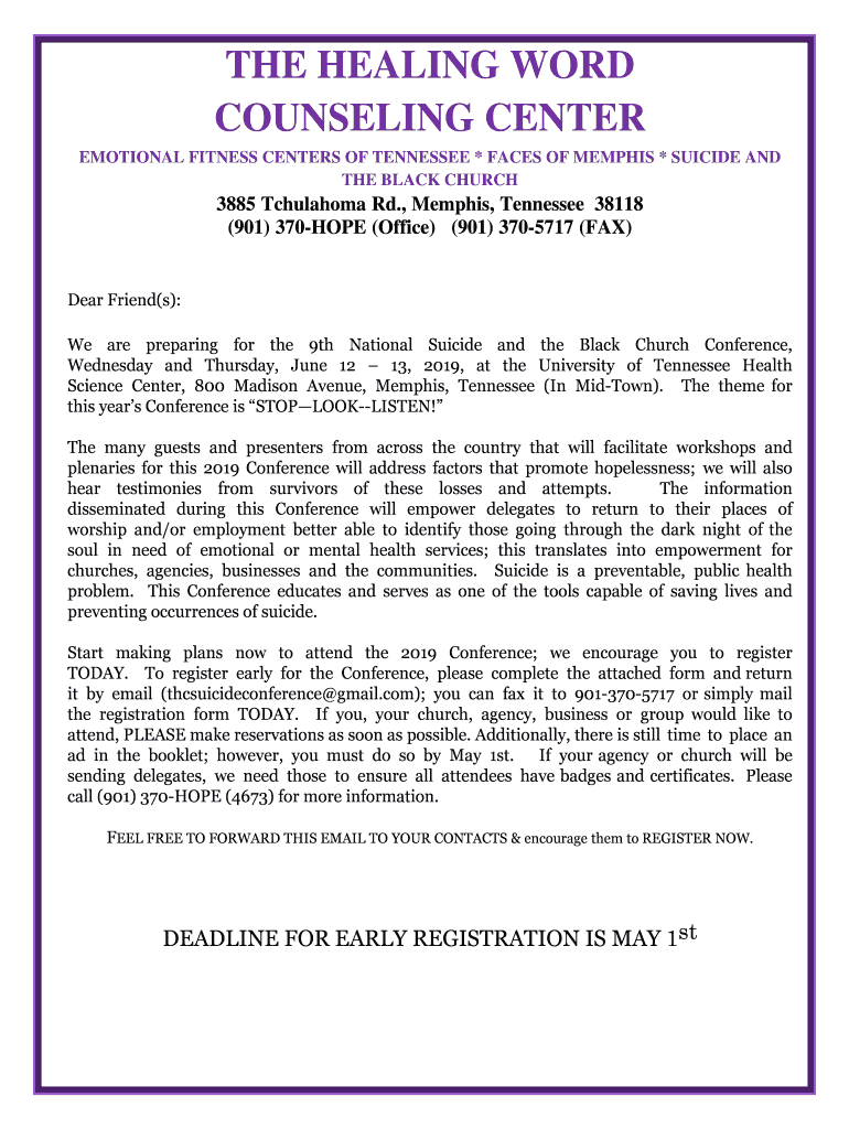 THE HEALING WORD COUNSELING CENTER EMOTIONAL FITNESS CENTERS OF TENNESSEE * FACES OF MEMPHIS * SUICIDE AND THE BLACK CHURCH3885 Tchulahoma Rd., Memphis, Tennessee 38118 (901) 370HOPE (Office) (901)