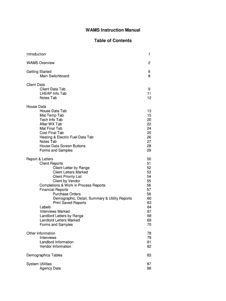 WAS Instruction Manual Table of Contents Introduction1WAMS Overview2Getting Started Main Switchboard6 8Client Data Client Data Tab CHEAP Info Tab Notes Tab9 11 12House Data House Data Tab Mat Temp