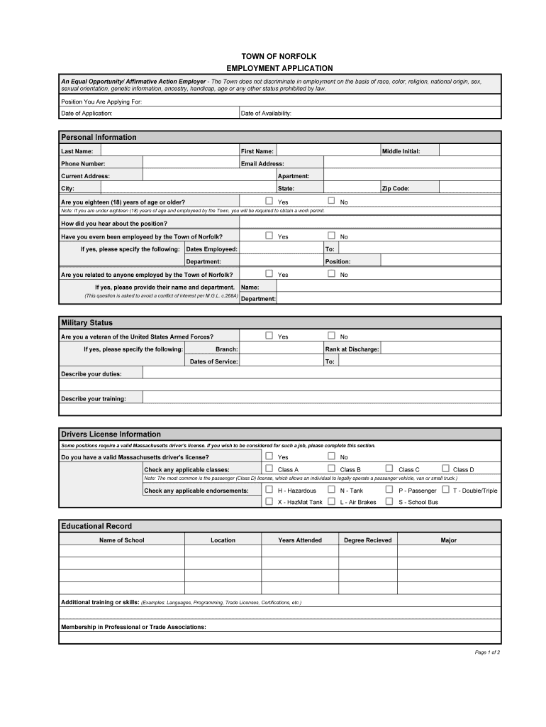 TOWN OF NORFOLK EMPLOYMENT APPLICATION An Equal Opportunity/ Affirmative Action Employer The Town does not discriminate in employment on the basis of race, color, religion, national origin, sex, sexual
