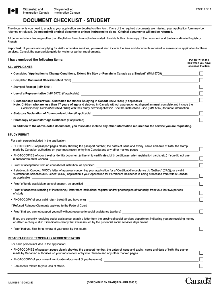 The Canada Student Immigration Document Checklist, known as form IMM 5555, is vital for students applying to study in Canada. This checklist assists applicants in ensuring they submit all necessary documents, aiding in the immigration process. The checklist, established in 2012, highlights the required items to include with the application, which reflects the importance of being aware of any updates to the form.