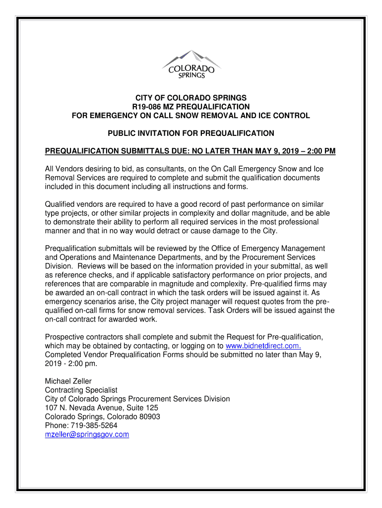 CITY OF COLORADO SPRINGS R19086 MZ PREQUALIFICATION FOR EMERGENCY ON CALL SNOW REMOVAL AND ICE CONTROL PUBLIC INVITATION FOR PREQUALIFICATION SUBMITTALS DUE: NO LATER THAN MAY 9, 2019 2:00 PM All