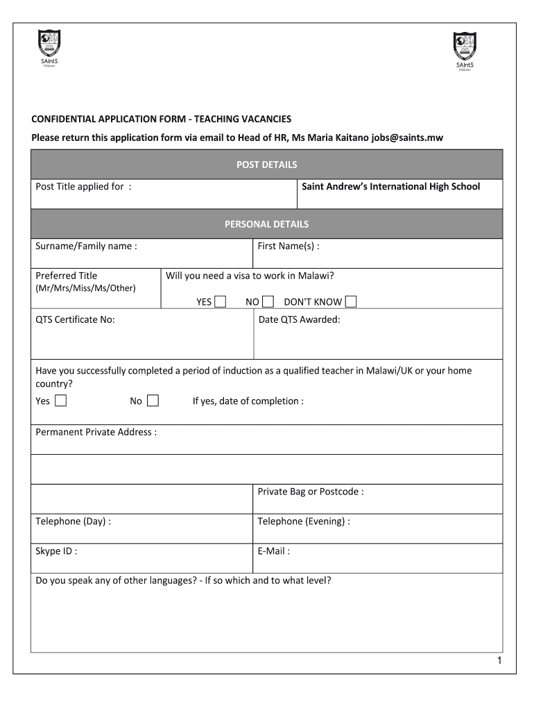 CONFIDENTIAL APPLICATION FORM TEACHING VACANCIES Please return this application form via email to Head of HR, Ms Maria Caetano jobs saints. MW POST DETAILS Post Title applied for :Saint Andrews International