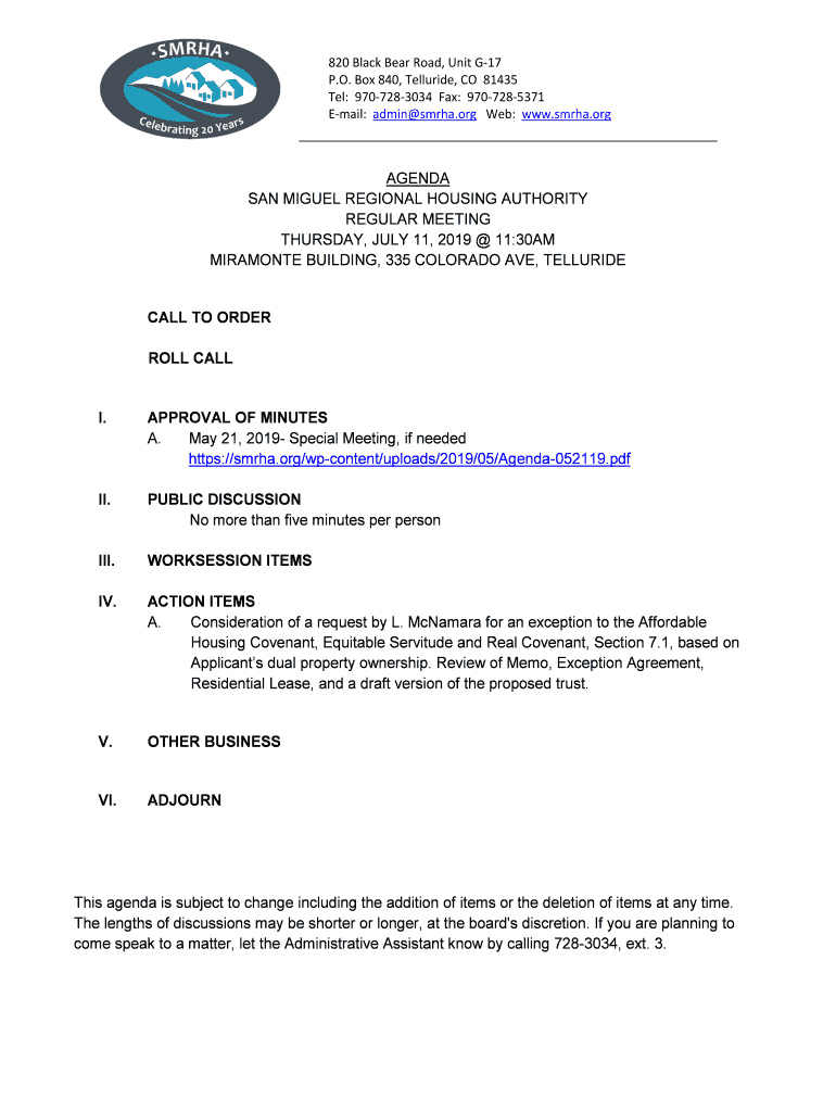 820 Black Bear Road, Unit G17 P.O. Box 840, Tellurium, CO 81435 Tel: 9707283034 Fax: 9707285371 Email: admin Sarah.org Web: www.smrha.orgAGENDA SAN MIGUEL REGIONAL HOUSING AUTHORITY REGULAR MEETING
