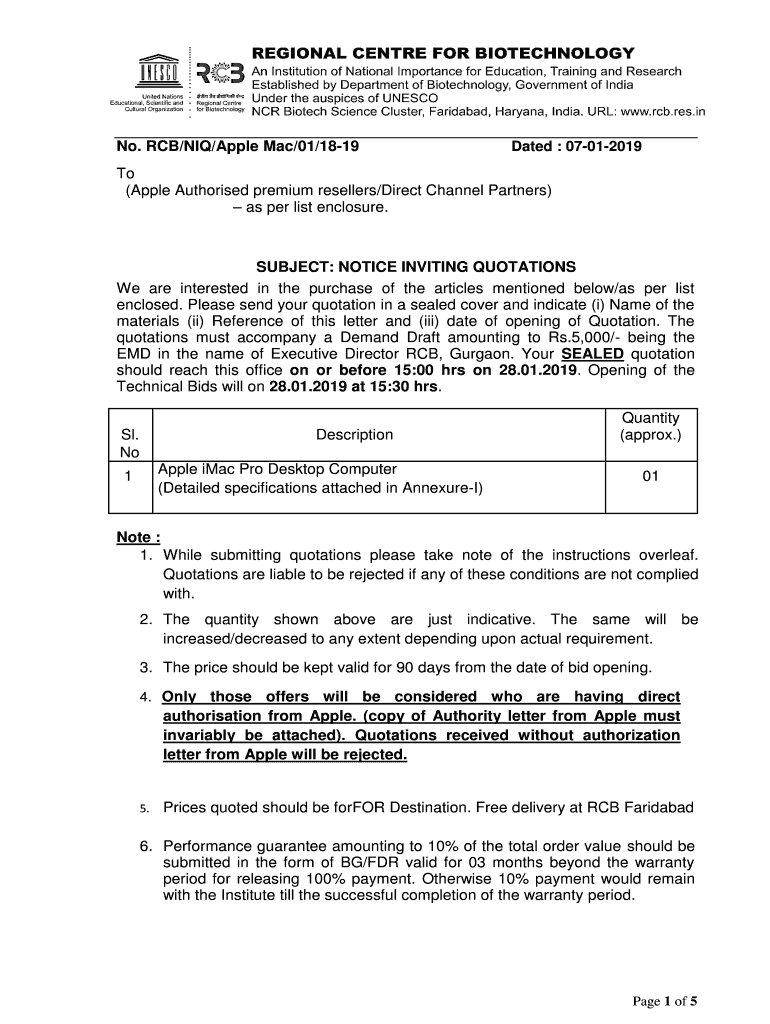 No. RCB/IQ/Apple Mac/01/1819Dated : 07012019To (Apple Authorized premium resellers/Direct Channel Partners) as per list enclosure.SUBJECT: NOTICE INVITING QUOTATIONS We are interested in the purchase