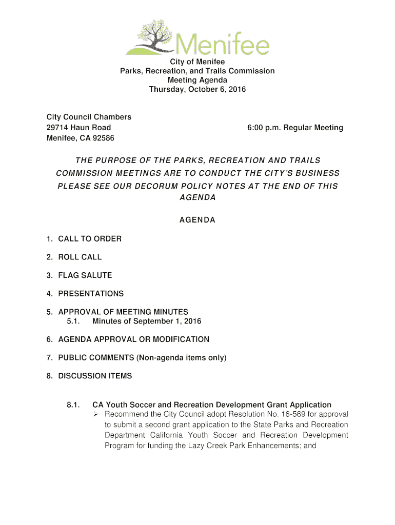 Menifee, CA 925866:00 p.m. Regular Meeting PURPOSE OF THE PARKS,