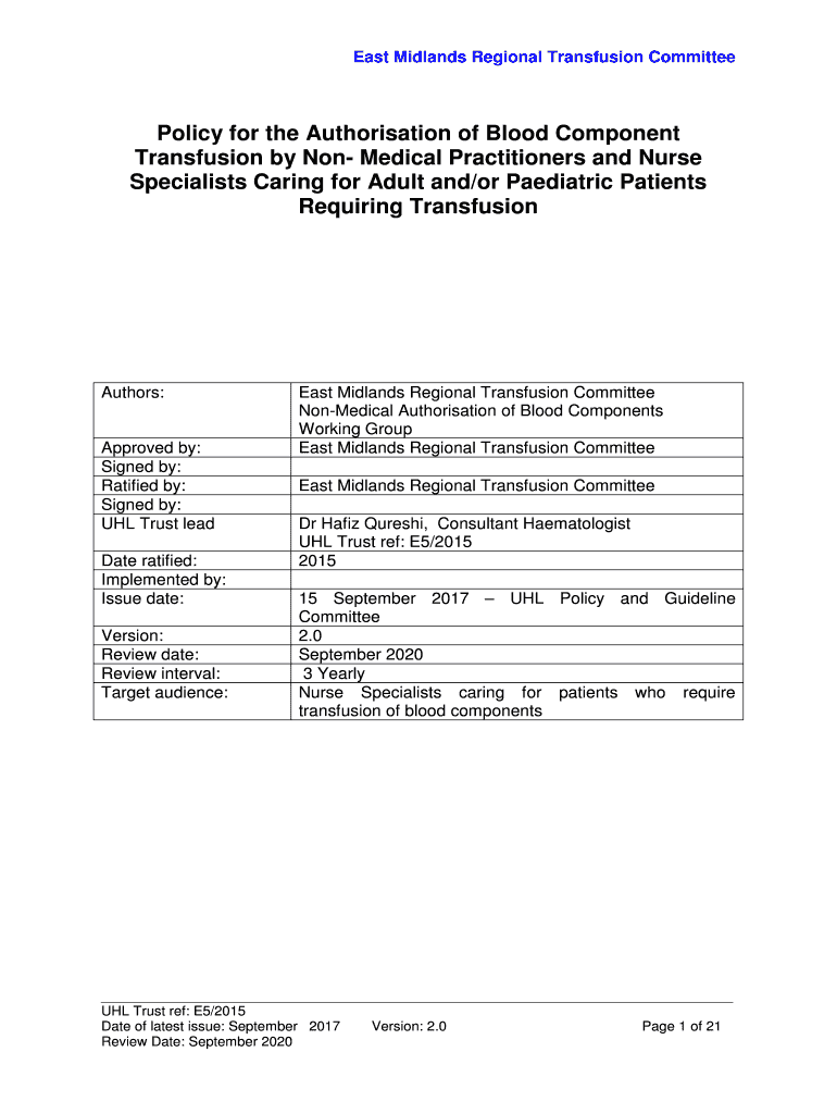 Get the free Blood Component Transfusion Authorisation By Non Medical ... - Library