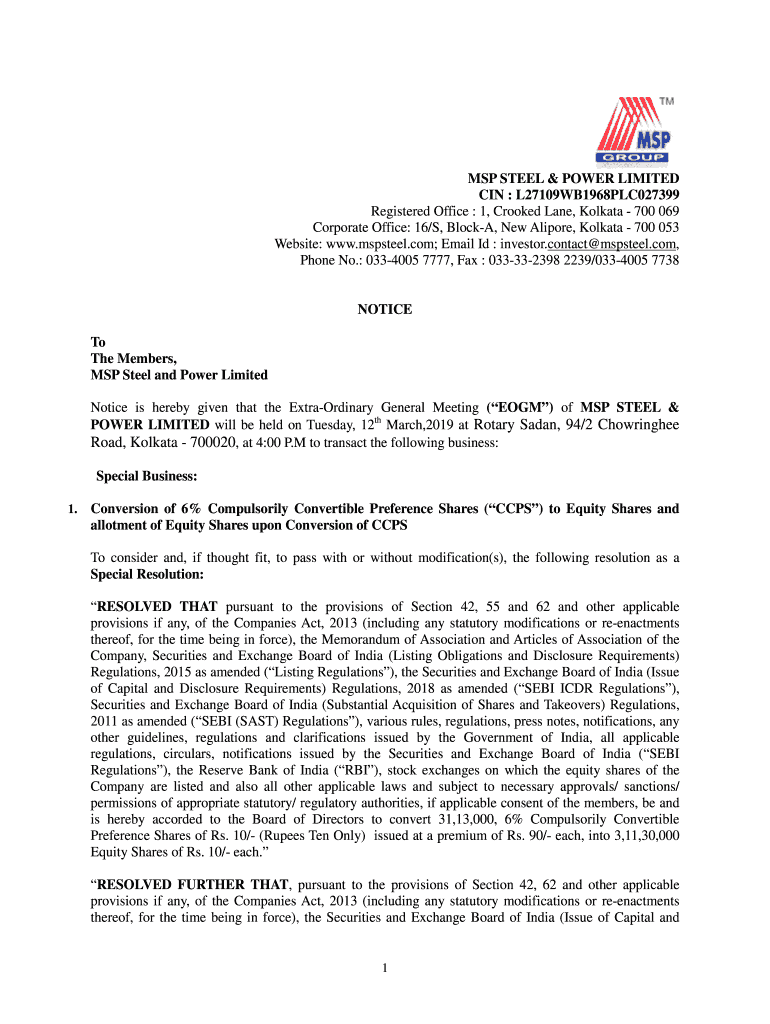 Get the free Notice for EGM - MSP Steel & Power Ltd