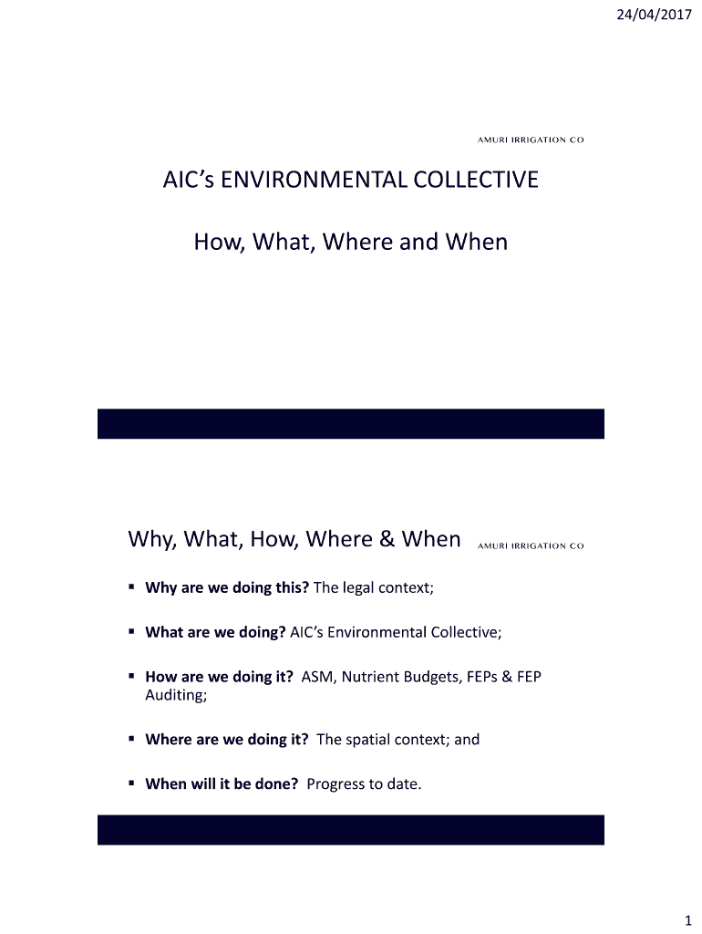 24/04/2017AICs ENVIRONMENTAL COLLECTIVE How, What, Where and When, What, How, Where & When Why are we doing this? The legal context; What are we doing? AIC's Environmental Collective; How are we doing