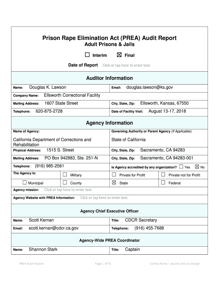 Prison Rape Elimination Act (AREA) Audit Report Adult Prisons & JailsInterimDate of ReportFinalClick or tap here to enter text. Auditor Information Name:Douglas K. LawsonEmail:Company Name:Ellsworth