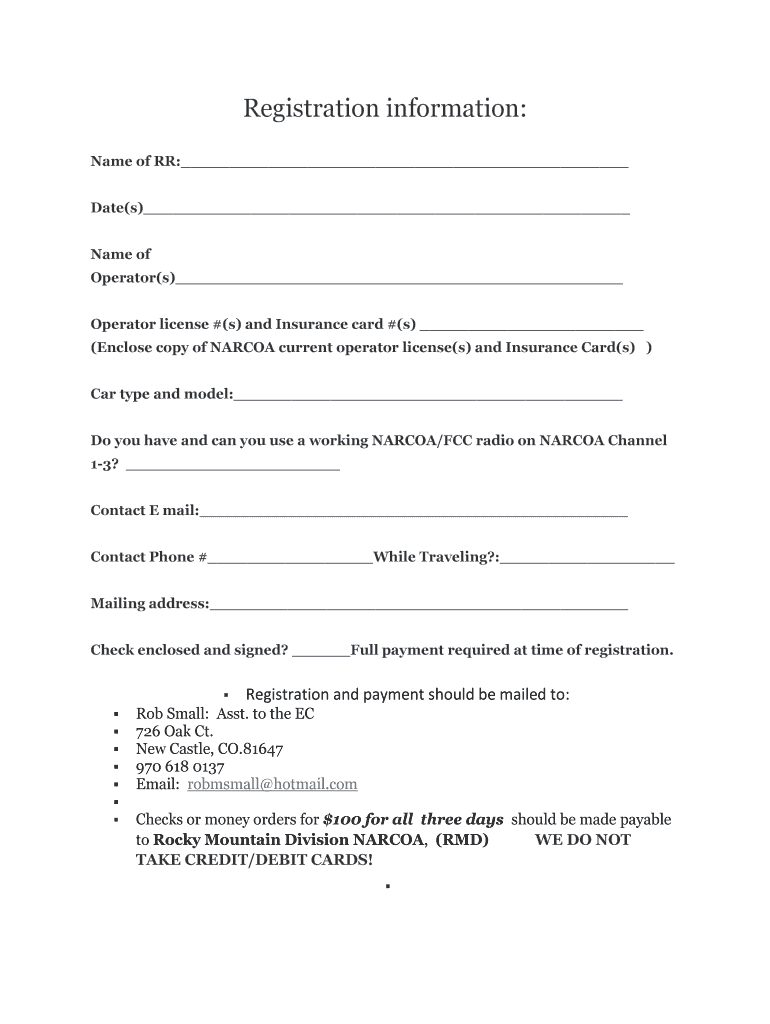 Registration information: Name of RR: Date(s) Name of Operator(s) Operator license #(s) and Insurance card #(s) (Enclose copy of NARROW current operator license(s) and Insurance Card(s)) Car type