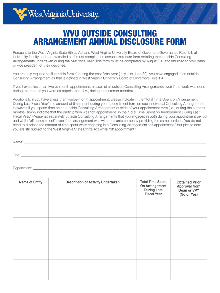 Faculty, staff, and employees of West Virginia University who engage in outside consulting arrangements are required to file the necessary forms.