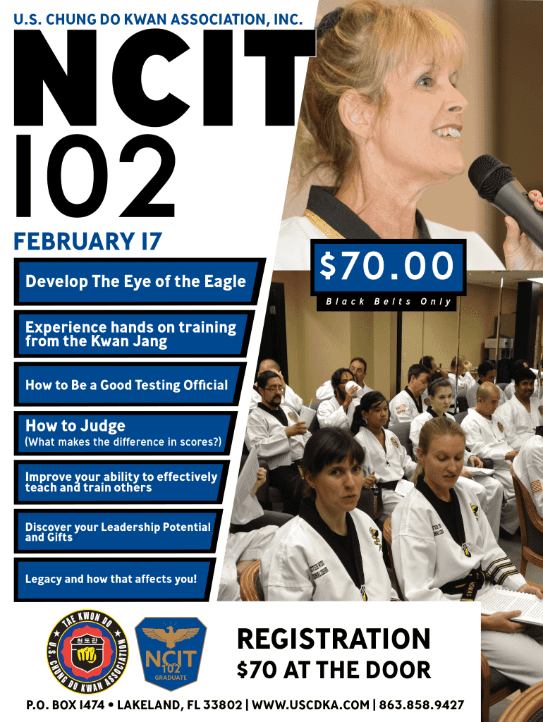 UNITED STATESCHUNG DO KWANASSOCIATIONNATIONAL CERTIFIED INSTUCTORSFEBRUARY 17, 2018 Lakeland, TRAINING 102 REGISTER ONE OF THREE WAYS!REGISTRATION Repayment must be submitted with registrationONLINE