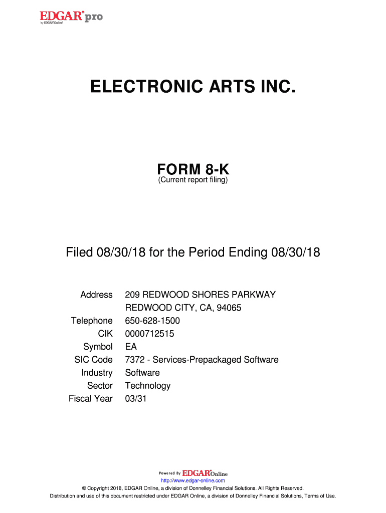 ELECTRONIC ARTS INC.FORM 8K (Current report filing)Filed 08/30/18 for the Period Ending 08/30/18 Address Telephone CIK Symbol SIC Code Industry Sector Fiscal Year209 REDWOOD SHORES PARKWAY REDWOOD