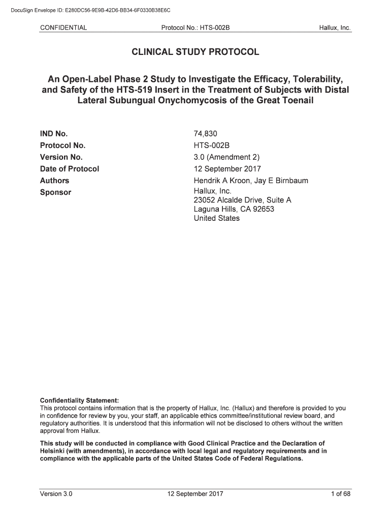 DocuSign Envelope ID: E280DC569E9B42D6BB346F0330B38E6CCONFIDENTIALProtocol No.: HTS002BHallux, Inc. CLINICAL STUDY PROTOCOL