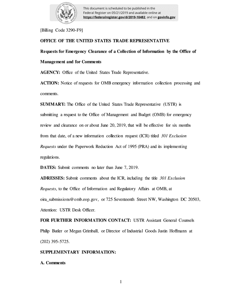 This document is scheduled to be published in the Federal Register on 05/21/2019 and available online at https://federalregister.gov/d/201910482, and on gov info.gov Billing Code 3290F9 OFFICE OF