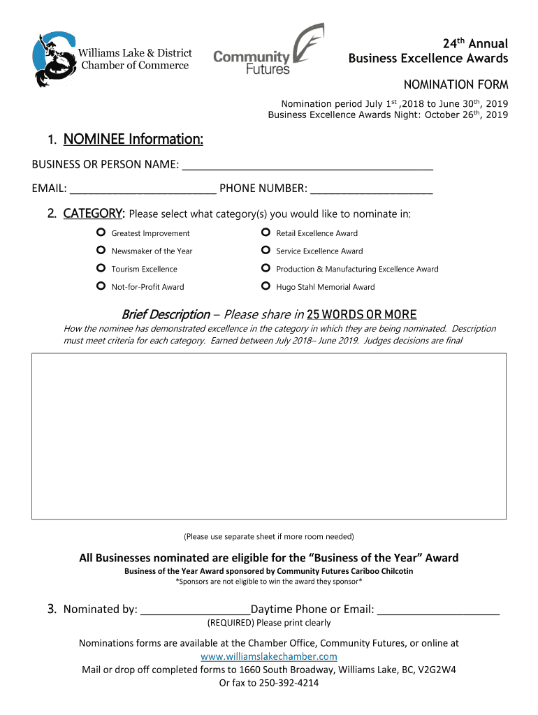 24th Annual Business Excellence Awards Williams Lake & District Chamber of CommerceNOMINATION FORM Nomination period July 1st, 2018 to June 30th, 2019 Business Excellence Awards Night: October 26th,