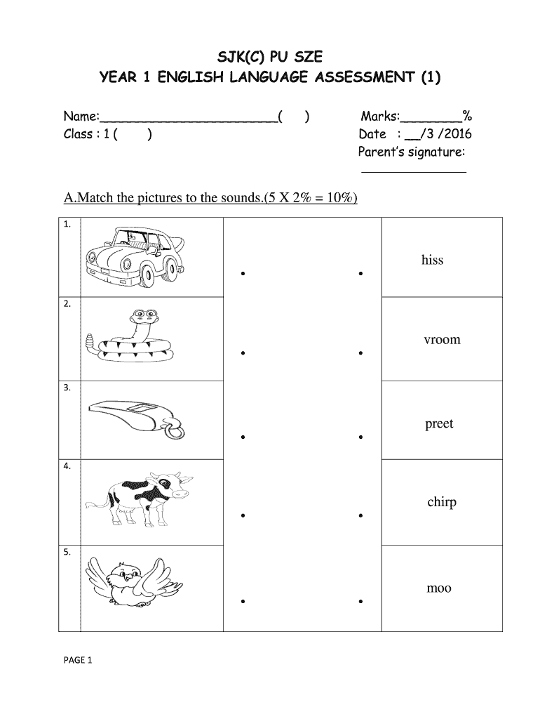 SK(C) PU SHE YEAR 1 ENGLISH LANGUAGE ASSESSMENT (1) Name: (Class : 1 ())Marks: % Date : /3 /2016 Parents signature: A. Match the pictures to the sounds.(5 × 2× 10%) 1.hiss2.vroom3.preet4.chirp5.PAGE
