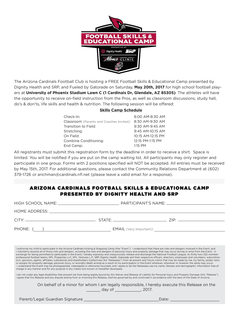The Arizona Cardinals Football Club is hosting a FREE Football Skills & Educational Camp presented by Dignity Health and SRP, and Fueled by Gatorade on Saturday, May 20th, 2017 for high school football