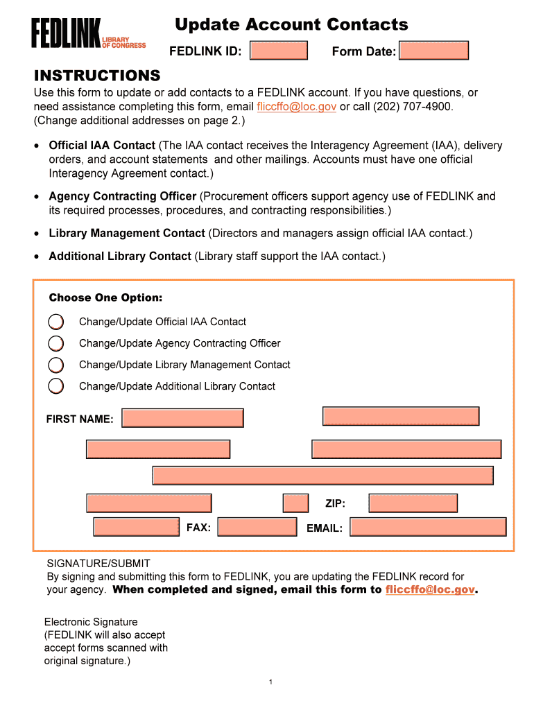 Update Account Contacts FEELING ID:Form Date:Instructions this form to update or add contacts to a FEELING account. If you have questions, or need assistance completing this form, email fliccffo LOC.gov