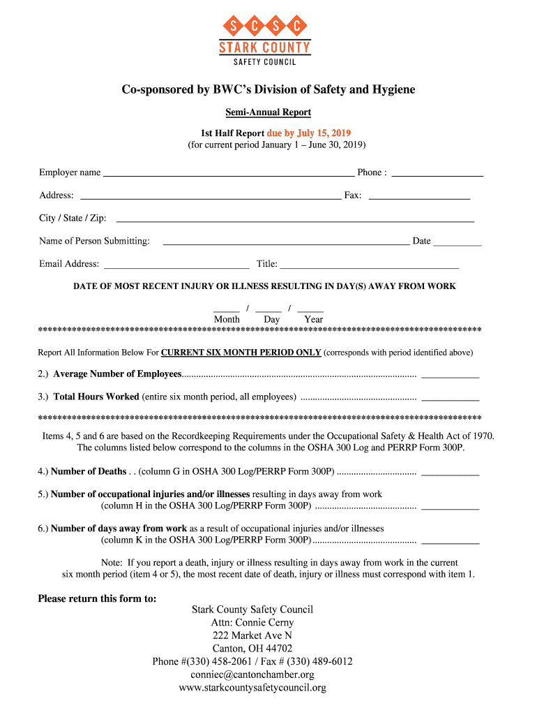 Cosponsored by BWC's Division of Safety and Hygiene Semiannual Report 1st Half Report due by July 15, 2019 (for current period January 1 June 30, 2019) Employer name Phone : Address: Fax: City / State