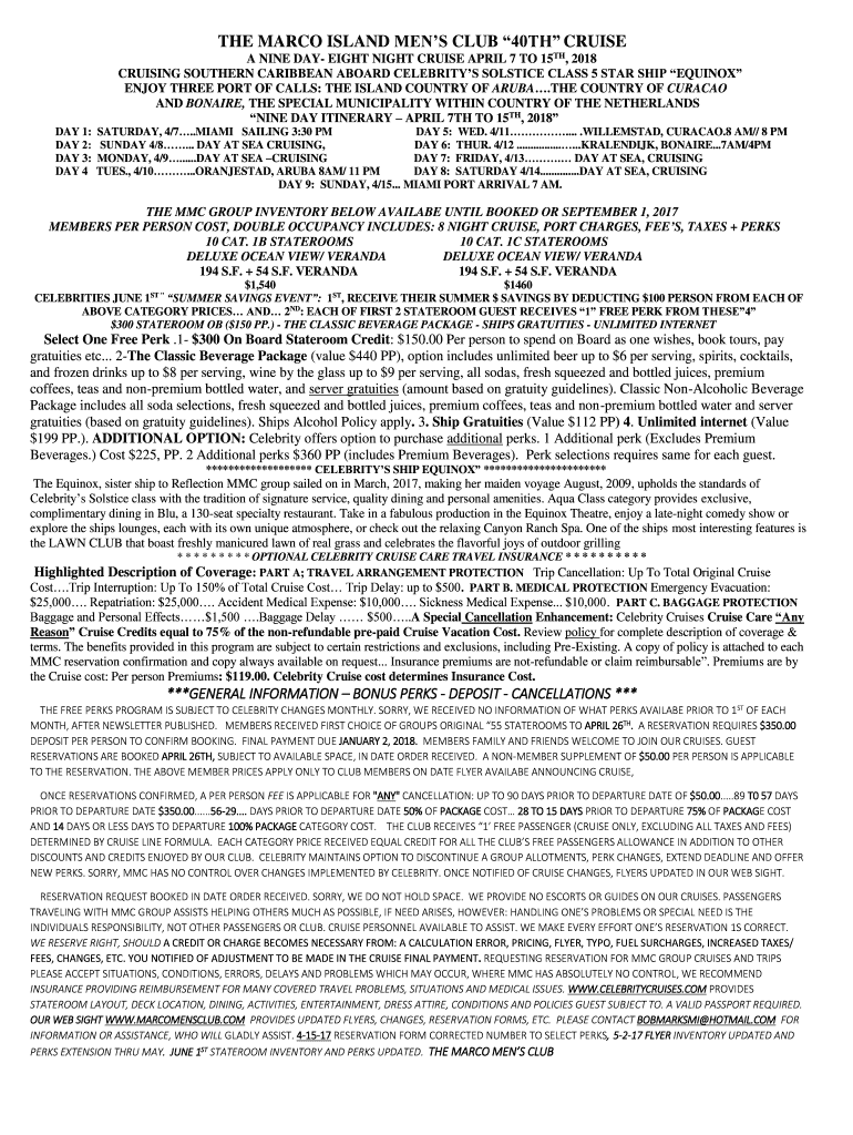 THE MARCO ISLAND MEN CLUB 40TH CRUISE A NINE-DAY EIGHT NIGHT CRUISE APRIL 7 TO 15TH, 2018 CRUISING SOUTHERN CARIBBEAN ABOARD CELEBRITY SOLSTICE CLASS 5-STAR SHIP EQUINOX ENJOY THREE PORT OF CALLS: