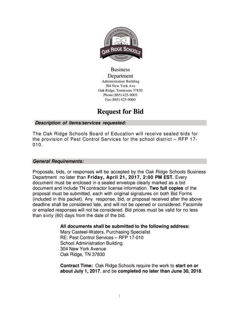 Business Department Administration Building 304 New York Ave Oak Ridge, Tennessee 37830 Phone (865) 4259003 Fax (865) 4259060Request for Bid Description of items/services requested: The Oak Ridge