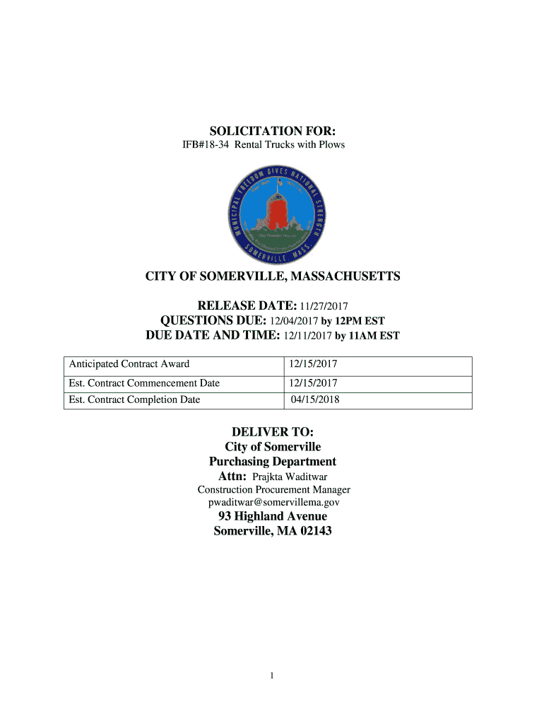 SOLICITATION FOR: IF×1834 Rental Trucks with PlowsCITY OF SOMERVILLE, MASSACHUSETTS RELEASE DATE: 11/27/2017 QUESTIONS DUE: 12/04/2017 by 12PM EST DUE DATE AND TIME: 12/11/2017 by 11AM EST Anticipated