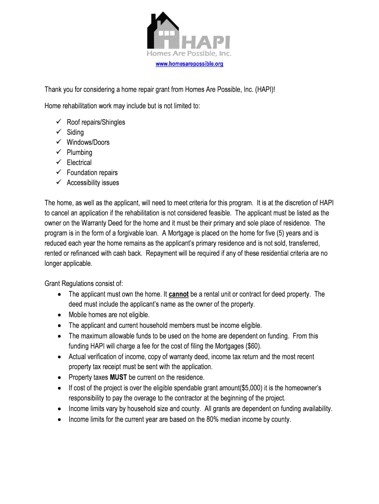 WWW.homesarepossible.organ you for considering a home repair grant from Homes Are Possible, Inc. (HOPI)! Home rehabilitation work may include but is not limited to: Roof repairs/Shingles Siding Windows/Doors