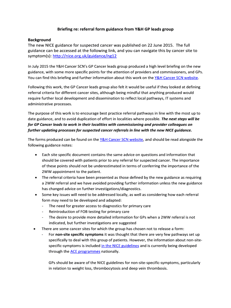 Briefing re: referral form guidance from Y&H GP leads group Background The new NICE guidance for suspected cancer was published on 22 June 2015. The full guidance can be accessed at the following