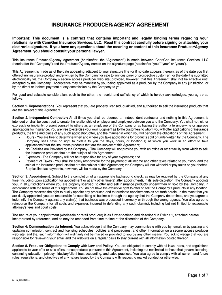 INSURANCE PRODUCER/AGENCY AGREEMENT