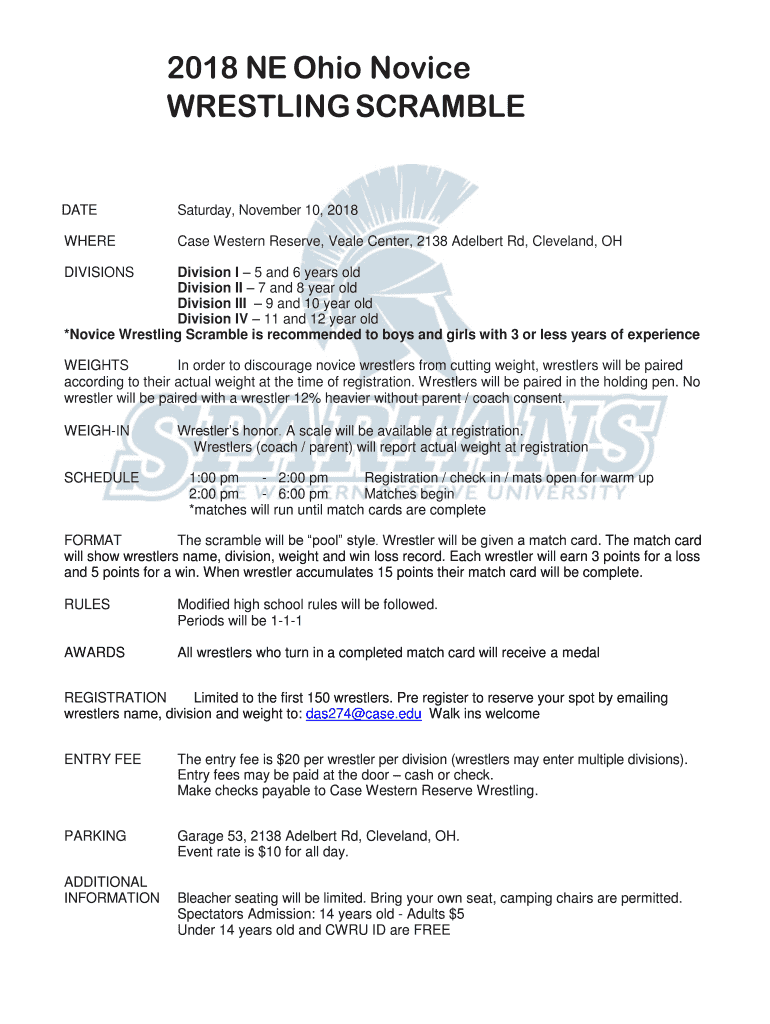 2018 NE Ohio Novice WRESTLING SCRAMBLEDATESaturday, November 10, 2018WHERECase Western Reserve, Vale Center, 2138 Delbert Rd, Cleveland, Division I 5 and 6 years old Division II 7 and 8-year-old Division