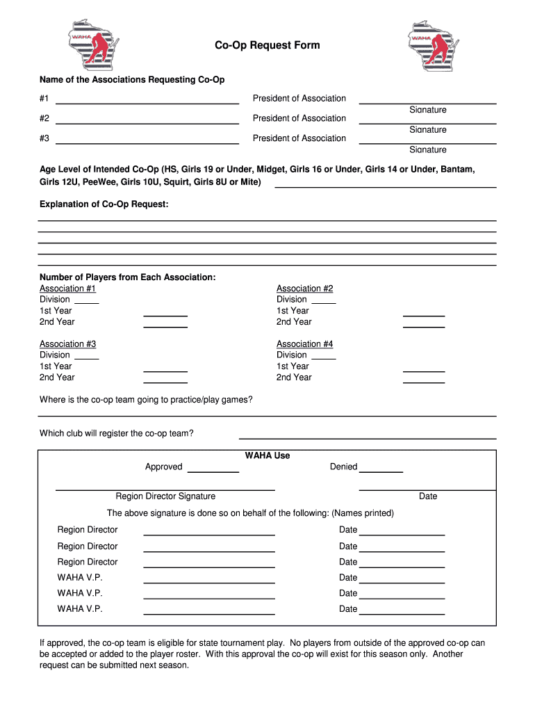 Coop Request Form Name of the Associations Requesting Coop #1President of Association×2President of Association×3President of AssociationSignature Signature Age Level of Intended Coop (HS, Girls