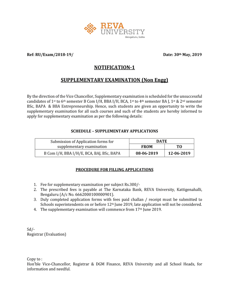 Ref: RU/Exam/201819/Date: 30th May, 2019NOTIFICATION1 SUPPLEMENTARY EXAMINATION (Non Egg) By the direction of the Vice Chancellor, Supplementary examination is scheduled for the unsuccessful candidates