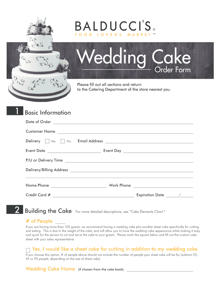 Wedding Cake Wedding Order Form Formulas fill out all sections and return to the Catering Department of the store nearest you.11Basic Information Date of Order Customer Name DeliveryYesNoEmail Address