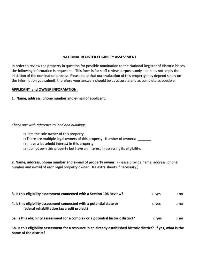 To fill out a national register eligibility assessment, one must provide detailed information about the property's history, architecture, and significance.